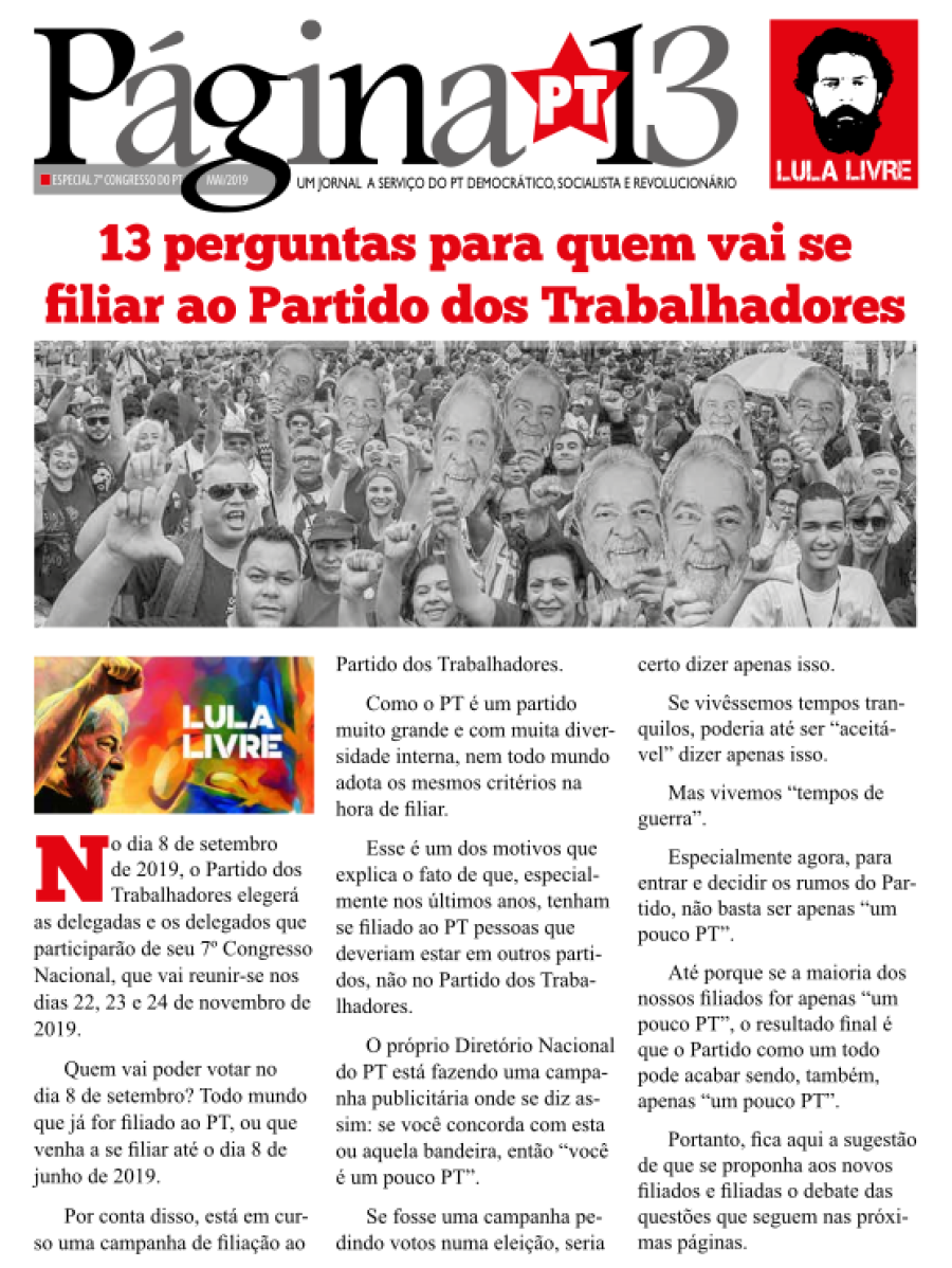 Página 13, Maio 2019, especial 7° Congresso do PT