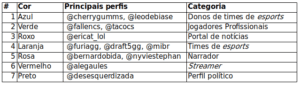 Com base na lista dos perfis mais proeminentes no debate (definidos por menções, respostas e retweets), viabiliza-se a análise das narrativas criadas pelas principais figuras que puxaram a hashtag #TodosContraPLS383. Do ponto de vista de classe, é possível ver que 50% dos perfis mais proeminentes (donos de times e páginas de times de esports) são os maiores beneficiados da não-definição de jogadores profissionais como atletas, por serem os principais exploradores da sua força de trabalho.